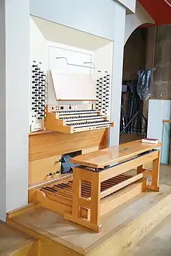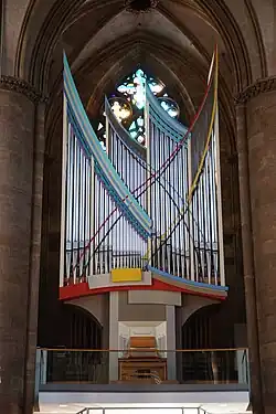 An ihrer Stelle steht heute eine Orgel von Johannes Klais Orgelbau. Sie verfügt über 57 Register auf drei Manualen und Pedal. Die Spieltraktur ist mechanisch, die Registertraktur ist mechanisch/elektrisch. Die Orgelweihe fand am 5. November 2006 statt. Die Orgel steht wie das Vorgängerinstrument vor dem Elisabeth-Fenster. Jedoch wurde die Orgelempore angepasst und das Instrument aus akustischen Gründen leicht nach vorne versetzt. Der Prospekt nimmt die Farben des Heilig-Geist-Fensters von Georg Meistermann sowie die Formen der Gotik auf.[80] Im Jahr 2020 wurde die Orgel um ein weiteres Register Mixtur auf 58 Register erweitert.[81] Des Weiteren hat die Orgel einen Registerschweller (auch Crescendowalze genannt), den man mit dem Fuß bedienen kann und somit einzelne Register dazuregistrieren oder abregistrieren kann, ohne die Hände zu benutzen. Außerdem sind noch zwei „Schwelltritte“ (siehe Schwellwerk) für das Positiv und das Schwellwerk vorhanden.
