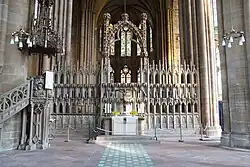 Der am 1. Mai 1290 geweihte Hochaltar ist aus bemaltem und filigranartig verziertem Sandstein gefertigt. Möglicherweise war er ursprünglich als Aufstellungsort für den Elisabethschrein gedacht, worauf die Gewölbeansätze an der Rückseite hinweisen. Die Vorderseite zeigt in drei dreigeteilten Nischen je drei Figuren, in der Mitte Maria, die von zwei Engeln gekrönt wird, in der südlichen Nische Elisabeth, die von Katharina und Maria Magdalena flankiert wird, und in der nördlichen Nische drei männliche Heilige, die im Zuge der Kirchenrestaurierung 1854–1861 rekonstruiert wurden. Die Malereien in den zweibahnigen Maßwerkblenden an den Schmalseiten und in den ungeteilten Blenden der Rückseite sind verblasst. An der nördlichen Schmalseite sind Heiligenbilder zu sehen, an der südlichen Seite die Verkündigungsszene und an der Rückseite König David und Propheten sowie der Besuch Marias bei Elisabeth. Die drei Wimperge und die vier Fialen sind mit Krabben, Kreuzblumen und Laubwerk reich besetzt. In den Zwickeln der Wimperge sind Tiere dargestellt, die als traditionelle Symbole für Christus stehen. Der südliche Wimperg zeigt das Agnus Dei und den Phoenix und der nördliche Wimperg einen Löwen mit Welpen und einen Pelikan, der seine Jungen ernährt.[56]