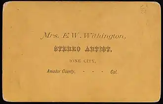 Im Jahr 1857 eröffnete Eliza auf der Main Street in Ione City ihr eigenes Fotostudio. In einer Anzeige im Amador Ledger vom 25. Juli 1857 gab sie an, „kürzlich nicht nur Bradys gefeierte Galerie in New York City besucht zu haben, sondern auch viele der renommierten Galerien in verschiedenen Staaten der Atlantikküste“.[2] Katherine Manthorne bezweifelt in ihrem 2020 erschienenen Buch zu amerikanischen Fotopionierinnen den aus dieser Aussage abgeleiteten Schluss früherer Biografen, Withington sei im Jahr 1856 zurück an die Ostküste gereist, um das Handwerk der Fotografie zu erlernen. Manthorne weist dabei auf den Umstand hin, dass die Durchquerung des amerikanischen Kontinents in der Mitte des 19. Jahrhunderts ein überaus schwieriges Unterfangen war und die Galerie Bradys bereits seit 1844 geöffnet war, so dass Withington auch schon vor ihrer Heirat ein Interesse an der Fotografie entwickelt haben könne.[3]