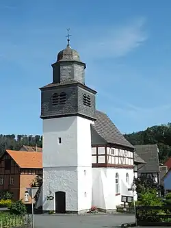 Sie wird 1408 erstmals urkundlich erwähnt (damals noch „Kapelle“ genannt). Das Mauerwerk stammt wahrscheinlich aus dem 13. Jahrhundert. Das Schiff ist rechteckig mit einem quadratischen romanischen Ostchor. Die schräg anlaufenden Stützpfeiler sind späteren Datums. Das Fachwerk ist im 17. Jahrhundert aufgesetzt worden, der Turm wurde im Zuge einer umfassenden Baumaßnahme 1926 neu errichtet. Im Altarraum links befindet sich ein Sakramentshäuschen mit gotischer Umrahmung und einer schmiedeeisernen Tür (vermutlich 14. Jahrhundert).