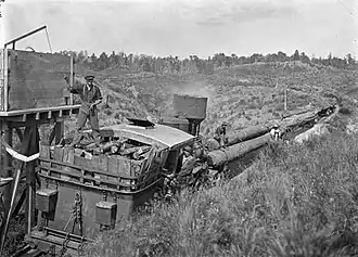 ![]() auf der Waldbahn bei Mangapehi um 1922 Climax-Lokomotive mit einem Langholzzug auf der Waldbahn bei Mangapehi um 1922 | |||||||||||||
