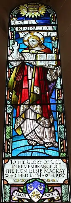 An Elsie Mackay erinnert ein Glasfenster im Chor der Kirche von Glenapp in Ballantrae, Ayrshire, wo ihre Familie das Schloss besaß.[42] Ihre Eltern ließen dieses Fenster sowie einen Glockenturm anbringen und die Kirche verschönern.[43] Auf der anderen Seite des Tals ließen sie Rhododendren pflanzen, die Elsies Namen formten und inzwischen so überwachsen sind, dass der Name kaum noch erkennbar ist.[44] Im kanadischen Gander wurde eine Straße nach ihr benannt.[45]