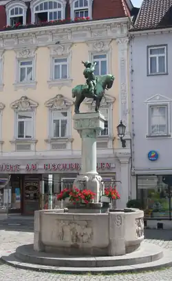Brunnenbüblebrunnen mit der Bronzefigur eines nackten Buben auf dem Brunnenstock, Spitzname Männeken Pis. Literatur: #Petzold 1989, Seite 61–62. |