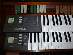 Durch mehrere gegeneinander leicht verstimmte Sägezahnwellen entsteht so der charakteristische, "schwebende" Klang, der in 8'- und 4'-Oktaven sowohl für das obere als auch das untere Manual aktivierbar ist. Außerdem gibt es auch hier einen Sustain-Effekt, der die Abklangdauer verlängert. Für das untere Manual kann auch die Lautstärke reguliert werden. Zusätzlich ist die Ensemble-Technik auch in leicht abgewandelter Form für die Prinzipal-, Solo- und Bass-Gruppe vorhanden.