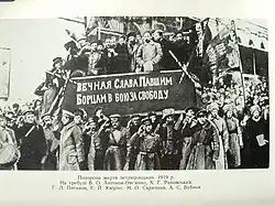 Begräbnis von Opfern der Herrschaft Petljuras, 1919. Auf der Tribüne (v. r. n. l.) Antonow-Owsejenko, Rakowski, Pjatakow, Quiring, N. A. Skripnik, Bubnow
