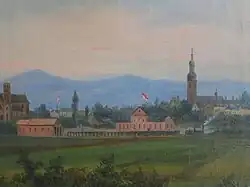 - ein Foto von 1868, das das Empfangsgebäude in festlicher Dekoration für den Empfang König Wilhelm I. von Preußen zeigt und