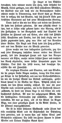 Der Kretin Blasel sieht wie ein Zwölfjähriger aus und gibt – wenn überhaupt – unverständlich Antwort. Trotzdem kenne Blasel den Weg. Als Ministrant führt Blasel mit der Kerze, die in einer Laterne brennt, und klingender Schelle Hiron tief hinein ins Gebirge. Bald wird der Weg schmaler, steiler und holpriger. Aus dem Nebel fallen Eisnadeln, später Flocken. Der Kaplan trägt das Ziborium mit der Hostie darin. Im Schneetreiben begegnen die beiden an einer Weggabelung einem Mädchen. Blasel läutet respektgebietend mit seiner Schelle. Der Führer und Ministrant schlägt sodann nicht den Weg nach links in die Scheiben ein, sondern rechts in den Karen. Es wird steiler. Weit oben versperren die Toten Öfen den Weg. Aus der Felsenkluft sieht Hiron im Schnee keinen Weg zurück. Blasel ist nicht ansprechbar und schläfrig. Der Kaplan sorgt sich um seinen Weggefährten, wärmt ihn und bewacht seinen Tiefschlaf die ganze Christnacht hindurch. Er baut aus Steinen einen Altar für das Ziborium. Dem Sterbenden, zu dem er gerufen war, kann er die Hostie nicht mehr reichen. Das Hochgebirge mit dem aufgehenden Mond um Mitternacht und der Sonnenaufgang am darauffolgenden Weihnachtsmorgen hat der Städter so noch nie erlebt. Er gerät in tiefes Staunen. So erweitert sich seine bisher nur auf das Sakrament gerichtete Frömmigkeit um die Nächstenliebe und die Bewunderung der Schöpfung.