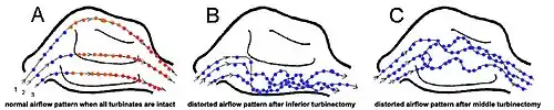 • Die Luftströmung wird turbulent, der Strömungswiderstand ist dadurch erhöht, es wird weniger Luft durch die Nase transportiert. Es resultiert das Gefühl der verstopften Nase.