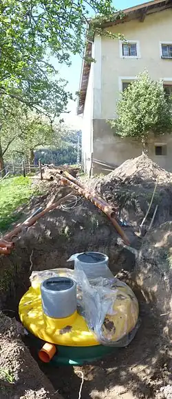 Imhoff-»Sickergrube« für ein südtiroler Bauernhaus, bereits versenkt. Vorne der Ausfluss zur Sickerleitung ist noch nicht angeschlossen. Hersteller: Rototec, Lunano, Pesaro-Urbino / Marken
