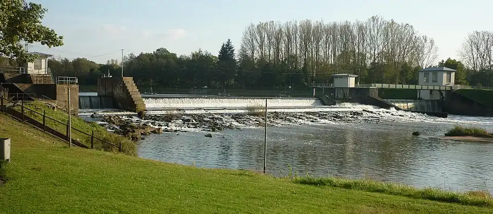 | Zugehöriges Wehr: | 4 Felder: 1 Überfallwehr, 3 Klappenwehre | |