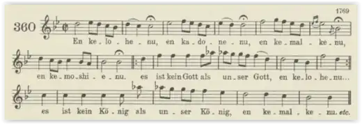 Es existieren verschiedene Melodien zu En Kelohenu. Am bekanntesten wurde im aschkenasischen Raum die Vertonung durch Julius Freudenthal im Jahr 1841.[10]