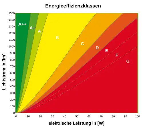 Am 18. März 2009 schuf die Europäische Kommission die Verordnung (EG) Nr. 244/2009[11] auf Grundlage der Ökodesign-Richtlinie des Europäischen Parlaments und des Rates im Hinblick auf die Festlegung von Anforderungen an die umweltgerechte Gestaltung von Haushaltslampen mit ungebündeltem Licht,[1] welche einen 6-Stufen-Plan zum Ersatz der Glühlampe durch Energiesparlampen enthält. Der Begriff „Energiesparlampe“ darf seit Inkrafttreten der Richtlinie 2005/32/EG (2010) nur noch für Energiesparlampen der Energieeffizienzklasse A genutzt werden.