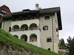 An der Seite sind auffällige Arkaden nach dem Vorbild des alten Klosters Chà Gronda in Unter-Scuol, dem heutigen Unterengadiner Museum, angebracht.