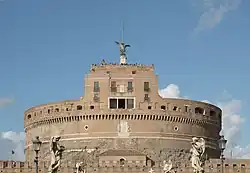 Der heutige Name der Anlage ist einer Legende entlehnt, die aus der berühmten Hagiographiensammlung Legenda aurea des Dominikaners Jacobus de Voragine aus dem 13. Jahrhundert stammt. Im Jahr 590, als Rom die Justinianische Pest erreichte, organisierte Papst Gregor I. der Große eine Bußprozession der römischen Bevölkerung, die in sieben Zügen zur heutigen Santa Maria Maggiore zog. Der Legende entsprechend soll den Teilnehmern über dem Grabmal Hadrians (das aus diesem Grund heute Engelsburg genannt wird) Erzengel Michael erschienen sein, der ihnen das Ende der Pest verkündete, indem er das Schwert des göttlichen Zorns in die Scheide steckte.[2] In der Realität fand die Pest mit der Bußprozession jedoch nicht ihr Ende, 13 Jahre später wurde die Prozession – offenbar aus gegebenem Anlass – wiederholt. Letztmals ist ein Ausbruch der Justinianischen Pest in Rom für das Jahr 722 bezeugt.[3] Die Prozessionsteilnehmer gelangten tatsächlich nicht einmal in die Nähe des Hadrian-Mausoleums.[4] Jedoch erinnert heute noch die Statue des Engels auf der Spitze des Gebäudes an jene legendarische Darstellung. Von 1577 bis 1752 stand dort oben ein von Raffaello da Montelupo geschaffener Engel aus Marmor, der heute im Innenhof, dem Cortile dell’Angelo, zu sehen ist. Dieser wurde 1752 durch die heutige, von Peter Anton von Verschaffelt entworfene Figur aus Bronze ersetzt.[5] Außerdem wurde dem Erzengel eine um 610 von Papst Bonifatius IV. eingebaute Kapelle gewidmet.