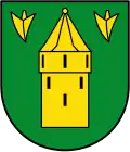 Blasonierung: „In Grün schwebend ein goldener (gelber) Turm begleitet rechts und links von je einer goldenen (gelben) Pflugschar.“[3] |