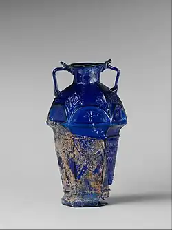 Ennionbecher - Mittleres 1. Jahrhundert n. Chr., 6 cm hoch; Durchmesser (mit Rand) 9,7 cm - Besteht aus in dreiteilige Form geblasenem, blauem Glas; zwei ösenförmige Bandhenkel an Rändern hinterher an oberster Reliefzone angesetzt → Zweihenklige Schale, senkrechte Wandung, unter Umbruch kegelförmig zulaufend, flacher Boden, abgesprengter und anschließend feingeschliffener Rand - Reliefdekor besteht aus zwei umlaufenden Friesen mit je zwei Seiten: - Von zwei Efeuranken eingefasste Inschrift oben: „Ennion hat es gemacht“ / „Möge sich der Käufer erinnern“ (Trennung der Seiten durch kleine Säulchen), „Buchstabendreher“ im Griechischen - Darunter von Zierleisten begrenzter Zungenfries - Konisch zulaufender Teil besitzt flächenfüllendes Rautenmuster - Bodenplatte verziert mit fünf konzentrischen Kreisen - Oberfläche fast völlig rein, wenige Ablagerungen (vor allem auf Innenseite von Henkel und Gefäß), zwei kleine rote Einschüsse, wenige Blasen