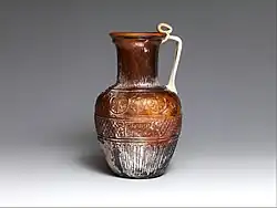 Drei Relieffriese am Gefäßkörper, einer am Hals - Hals: unten von vier Leisten begrenztes Zungenmuster - Schulter: Palmettenfrieß, jede zweite Palmette wird von Ranke eingefasst, Palmetten hängen von unterster Leiste u. werden durch obere Leisten getrennt vom mittleren Teil, einem Dekorband mit flächenfüllendem, an Bienenwaben erinnerndem Rautenmuster - Unter Henkelansatz befindet sich tabula ansata (rechteckige Inschriftentafel mit dreieckigen oder peltenformigen Ansätzen), griech. Inschrift („Ennion hat es gemacht“) - Unterer Gefäßteil ist mit Zungenmuster verziert - Abnutzungserscheinungen am Gefäßboden, Fuß wurde nach Vorbild von Kanne aus Haaretz Museum ergänzt, die im jüdischen Viertel der Jerusalemer Altstadt ergraben und wohl durch die Feuersbrunst von 70 n. Chr. verformt wurde