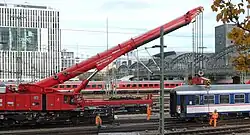 Für die Bergung von Schienenfahrzeugen können Krane wie Eisenbahndrehkrane, straßenfahrbare Mobilkrane oder Schwimmkrane eingesetzt werden. Bei elektrifizierten Strecken können die Oberleitungsanlagen den Einsatz von Kranen behindern, so dass sie abgebaut oder seitlich verschwenkt werden müssen. Dies kann mit erheblichen Aufwand verbunden sein, weshalb schienengebundene Krane auf elektrifizierten Gleisen häufig nur in Sonderfällen eingesetzt werden.[9] Moderne Eisenbahndrehkrane sind jedoch so konzipiert, dass sie Lasten auch unter eingeschalteter Oberleitung verfahren können und somit die Einschränkungen durch die Oberleitungsanlagen weniger zum Tragen kommen. Zum Aufgleisen unter Fahrleitungen sind sie jedoch wegen der verfügbaren Höhe nur bei Flachwagen verwendbar.