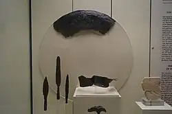 Bronzeschild, Wangenteil eines Bronzehelmes und Weihinschrift aus dem Heiligtum
