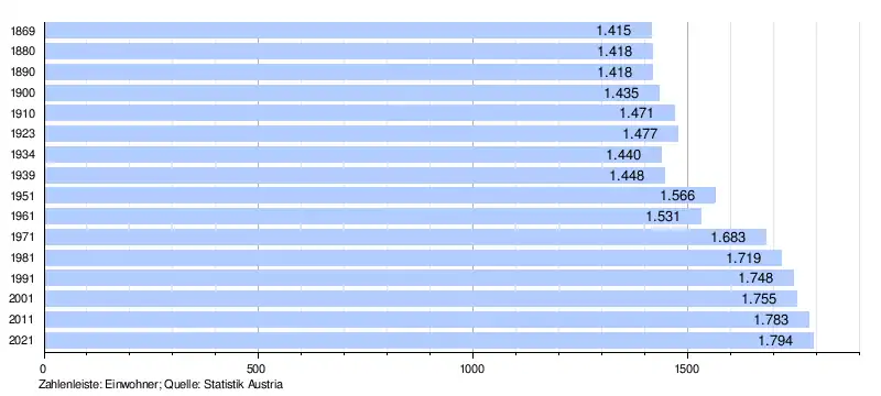 1991 hatte die Gemeinde laut Volkszählung 1.748 Einwohner, 2001 dann 1.755 Einwohner. Die Zunahme erfolgte trotz negativer Wanderungsbilanz (−61), da die Geburtenbilanz größer war (+68). Von 2001 bis 2011 kam die Abwanderung fast zum Erliegen (−4), sodass die Bevölkerungszahl auf 1.783 im Jahr 2011 anstieg.[2]