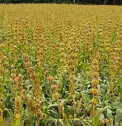 Feld mit Gelbem Enzian in Frankreich mit bereits reifen Fruchtständen