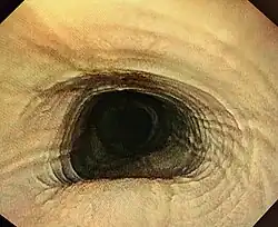 Die endoskopisch sichtbaren Veränderungen der Speiseröhre sind vielgestaltig und hängen von der Dauer der Krankheit ab. Neben dem sogenannten Baumring-Aspekt oder Baumring-Struktur und der hoch vulnerablen Krepp-Papier-Mukosa werden Längsfurchen, Ödem, weiße Exsudate und andere Veränderungen der Mukosa gesehen. Bei einem ausgeprägten Baumring-Aspekt spricht man von der „Trachealisierung“ der Speiseröhre, weil sie dann der Luftröhre (Trachea) ähnelt. Engstellen (Strikturen oder Stenosen) treten bei länger andauernder Krankheit auf. Da die erste Endoskopie oft im Rahmen einer Notfallsituation aufgrund der Bolusobstruktion erfolgt, werden die teils nur diskret ausgebildeten Veränderungen eventuell übersehen. Im endoskopischen Ultraschall sind gelegentlich Längsfurchen mit Verdickung der Mukosa darstellbar.
