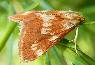 Die Falter haben eine Flügelspannweite von 17 bis 22 mm[1] (17–20 mm[2] bzw. eine Vorderflügellänge von 9 bis 10 mm[3]). Zeichnung und Färbung sind variabel. Die Grundfarbe ist gelbbraun, hellbraun, rotbraun, kastanienbraun bis dunkelbraun, im Osten des Verbreitungsgebietes kommen überwiegend hellere Exemplare vor, was zur Aufstellung der subsp. orientalis Caradja, 1916 führte. Gelegentlich wird der Flügel zum Außenrand hin etwas dunkler. Die Hinterflügel sind meist etwas dunkler als die Vorderflügel und können auch braun bis schwärzlich braun sein. Im Mittelfeld kann eine Reihe länglicher, gelber oder gelbweißer Punkte ausgebildet sein, die sich in der Flügelmitte in zwei Reihen aufspaltet. Im Extremfall kann die Punktreihe auf ein oder zwei Punkte nahe dem Flügelvorderrand reduziert sein. Im anderen Extremfall kann die sich aufspaltende Punktreihe auch als eine durch schmale Zwischenräume unterbrochene, sich zum Vorderrand aufspaltende gelbe Binde beschrieben werden. Bei derart hellen Exemplaren sind auch im Wurzelfeld zwei bis drei dicht stehende Wurzelstriche ausgebildet. Auch eine helle Saumlinie oder eine in Punkte aufgelöste Saumlinie kann vorhanden sein. Die Hinterflügel sind meist einheitlich gefärbt oder werden zum Außenrand hin etwas dunkler und tragen sehr selten einige wenige, undeutliche helle Flecke im Mittelfeld oder einen undeutlich ausgebildeten Wurzelstrich. Die Fransen sind bei Vorder- und Hinterflügeln meist etwas heller als die Grundfarbe, besonders wenn die Flügel zum Außenrand hin etwas dunkler werden.