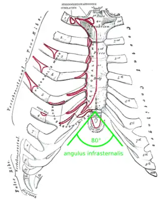 Der epigastrische Winkel (Angulus infrasternalis) wird durch das Zusammentreffen des rechten und des linken Rippenbogens am Schwertfortsatz (Processus xiphoideus sterni) gebildet, er beträgt im Normalfall etwa 80°.