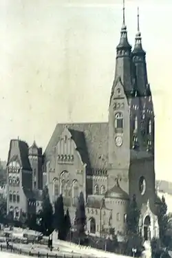 Im Südwesten wurde ein zweigeschossiger Anbau errichtet, in dem sich u. a. die Sakristei befand. Der Mauerwerksbau ist mit roten Ziegeln und braunen Terrakottafliesen verblendet, der Sockel und das Portal, das sich an der Turmfront befindet, sind aus Natursteinmauerwerk. Der Portalvorbau besteht aus einer kielbogenüberfangenen Rundbogennische, darüber eine kleine Fensterrose, die Glockenstube hat rundbogige Schallöffnungen. Die quadratischen Turmenden mit geschweiften Giebeln und steilen polygonalen Helmen sind mit barocken Hauben bekrönt. Die Giebel des Querschiffes sind verziert. Über dem Hauptgesims befindet sich eine spitzbogige Attika.