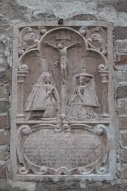 Das 88 cm hohe und 58 cm breite Epitaph aus Rotmarmor für Ruprecht Surauer († 4. April 1658), Äußerer Rat und Lebzelter (Lebkuchenbäcker), und seine Ehefrau Regina Surauer († 5. Dezember 1675), geborene Thalhamer, zeigt in den oberen Ecken die Wappen der Verstorbenen mit den Initialen RS (links) und RT (rechts). Das Ehepaar wird kniend unter dem Kreuz dargestellt, die Frau trägt einen breitkrempigen Hut.