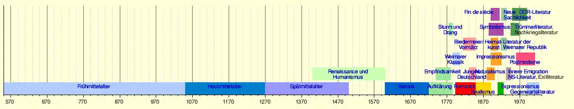 Eric Achermann: Epochennamen und Epochenbegriffe – Prolegomena zu einer Epochentheorie. In: Zeitenwende – Die Germanistik auf dem Weg vom 20. ins 21. Jahrhundert. Akten des X. Internationalen Germanistenkongresses Wien 2000. Hrsg. von Peter Wiesinger. Band 6. Epochenbegriffe. Grenzen und Möglichkeiten. Betreut von Uwe Japp, Ryozo Maeda und Helmut Pfotenhauer. (= Jahrbuch für Internationale Germanistik. Reihe A. Kongressberichte, Band 58). Lang, Bern 2002, S. 19–24.