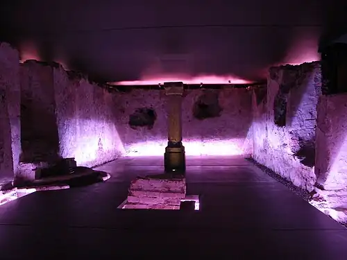 Für den neuen Eingang in den Schauraum wurde nicht der ursprüngliche Abgang verwendet, sondern ein Stück der Originalmauer herausgesägt, sodass ein Querschnitt des verwendeten Baumaterials zu sehen ist. Der Unterschied im Material erklärt sich aus der Verbindung des Ursprungsbaus mit dem jüngeren Anbau. Rechts wurden die verbrannten Gebeine wieder an der Fundstelle bestattet. Eine Lichtprojektion mit Text weist auf die Knochensplitter hin.[24] Südwestlich davon wurden zwei neue Räume für die Technik eingerichtet.[25]