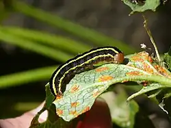 Die Raupen können in grünen oder rotbraunen Formen auftreten. Eine Rückenlinie fehlt, dagegen sind die breiten hellgelben Nebenrückenlinien und Seitenstreifen sehr auffällig. Der Kopf ist gelblichbraun bis gelblichgrün[5].[3] Ausgewachsen werden sie bis 45 mm lang.[6]