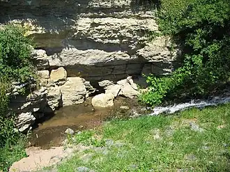 Zwischen Dorf-Erbach und Stockheim stellt sich dem Bachlauf ein Bergrücken aus Muschelkalk entgegen, der in das Tal der Mümling hineinragt und über den die Eulbacher Straße führt. Hier in der Nähe des Erbacher Sportparks versinkt der Erdbach vollständig in fünf Höhlenlöchern einer Flussschwinde am Fuße einer kleinen Felswand.