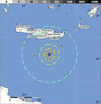 Die Koordinaten des Epizentrums werden mit 34°14‘25‘‘N und 25°28‘40‘‘E angegeben. Dies entspricht einer Position im Libyschen Meer rund 100 Kilometer südlich von Ierapetra. Die Herdtiefe des Bebens lag bei 19 Kilometer. Am Epizentrum wurde eine Intensität von VII ermittelt, auf dem kretischen Festland jedoch nur noch V.