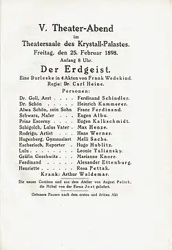 - ↑ Frank Wedekind: Erdgeist. Langen, Paris und Leipzig 1895. (Digitalisat und Volltext im Deutschen Textarchiv)