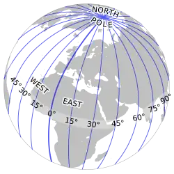 - Geodäsie: Die Nord- und die Südhemisphäre, wie sie sich aus der Breite bezüglich des Erdäquators ergeben, sowie die östliche und die westliche Hemisphäre, nach dem Längengrad bezüglich des Nullmeridians und des 180. Längengrads. Der einzige Staat der Erde, dessen Staatsgebiet in allen vier Erdhemisphären liegt, ist Kiribati, ein Inselstaat im Pazifik.