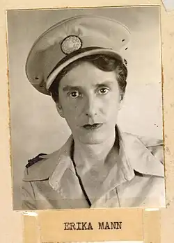 Von 1943 bis 1945 war Erika Mann Kriegsberichterstatterin für diverse Zeitungen und war dabei in Status und Bezahlung einem US-Offizier im Range eines Captain gleichgestellt.[22] So war sie als Kriegskorrespondentin mit der Ninth Army der US-Streitkräfte unterwegs und hielt sich unter anderem in Ägypten, Belgien, Frankreich und Palästina auf. Ebenfalls 1943 begann sie mit der Niederschrift ihrer Autobiografie mit dem Titel I Of All People (dt. Ausgerechnet Ich), die jedoch Fragment blieb. In ihrer Funktion als Kriegsberichterstatterin war sie auch vor Ort, als am 6. Juni 1944 die Westalliierten in der Normandie landeten. Nach der Kapitulation Deutschlands im Mai 1945 war sie in ihrer alten Heimat und sah die zerstörten Städte. Konfrontiert mit Tätern und Mitläufern, verfasste sie einen Erfahrungsbericht, Alien Homeland, den sie jedoch nicht vollendete. In unversöhnlicher Härte verurteilt sie darin die larmoyante Haltung mancher Landsleute, die sich in Selbstmitleid flüchteten und von gemeinschaftlicher Verantwortung nichts wissen wollten.[23]