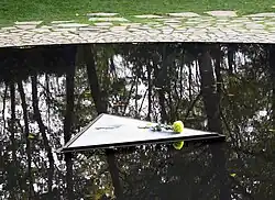 Denkmal für ermordete Sinti und Roma im Großen Tiergarten in Berlin (Detail: Brunnenmitte mit Stein und frischer Blume auf Dreieck, das an den KZ-Winkel erinnert)