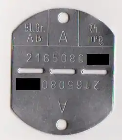 Auf der Erkennungsmarke der NVA steht auf der Vorderseite neben dem Länderkennzeichen „DDR“ die Personenkennzahl des Armeeangehörigen. Auf der Rückseite ist die Blutgruppe vermerkt. Die Personenkennzahl setzt sich zusammen aus dem Geburtsdatum (TTMMJJ), dem Geschlecht (in diesem Fall 4 für männlich) und der lebenslangen Personennummer.