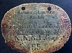 Die abgebildete Erkennungsmarke rechts wurde während des Ersten Weltkriegs an einen Soldaten des Ersten Garde-Regiments ausgegeben. Die Markierung „Anton Stamnitz. Spandau 6.5.95 Ers Batt.1 Gard. Jnf.Leib / K.K.R.1.G.J Nr.455“ bedeutet: „Name: Anton Stamnitz Geboren in Spandau Datum: 6. Mai 1895 im Kombinierten Kavallerie-Regiment der 1. Garde-Infanterie-Division Nr. 455“.