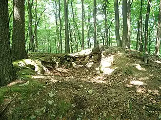 In unmittelbarer Nähe des Weilers befindet sich in westlicher Richtung auf der Ostseite des Buchenberges ein kleiner Burgstall. Erhalten hat sich von ihm nur ein Halsgraben, dem ein weiterer angefangener, aber nicht vollendeter Graben vorgelegt ist. Auf der Burgfläche ist neben einem Wall in einem Raubgrabungsloch noch Mauerwerk sichtbar. Die sehr kleine Burganlage bestand wohl nur aus einem (turmförmigen?) Gebäude.