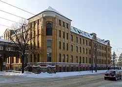 Es handelt sich um eine fünf- bis sechsgeschossige Dreiflügelanlage mit einem gestaffelten siebengeschossigen Eckrisaliten, auf den ein dreigeschossiger Turm mit elliptischem Grundriss aufgesetzt wurde. Darauf befindet sich ein von einer Aussichtsplattform umgebener zweigeschossiger runder Kuppelbau, der ursprünglich als Sternwarte gedacht war. Das Gebäude ist in Stahlbetonbauweise errichtet[5] und durch Pilaster vertikal gegliedert.