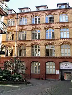 Das Gebäude mit den zwei Höfen wurde von dem Architekten Reinhard Brehm als Wohnhaus mit Fabrikgebäude für eine Bonbon-, Marzipan- und Schokoladenfabrik[1] entworfen und 1896–1897 als einer der ersten Bauten im Südteil der Straße erbaut, die damals noch Tilsiter Straße hieß. Bereits 1905 wurde das Gebäude durch eine Klinik übernommen und die Süßwarenproduktion eingestellt. Ab 1922/1923 nutzte die Firma Osram das Gebäude und ab 1926/1927 die Norddeutsche Schriftgießerei.