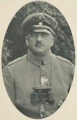 Nach Ausbruch des Ersten Weltkrieges wurde er am 2. August 1914 unter seiner Aufsicht das Königlich-Sächsische Feld-Artillerie-Regiment Nr. 24 mobilisiert, das er als Regimentskommandeur befehligte. Er war bis dahin zum Oberstleutnant befördert. Er rückte mit seinem Verband noch im selben Monat an die Westfront.[1] Im November desselben Jahres wurde er für seine Verdienste mit dem Eisernen Kreuz I. Klasse ausgezeichnet.[2] Er nahm an der Schlacht an der Marne im Jahr 1914 teil, wo sein Regiment der Rückzug der 3. Armee deckte.[3] Er zeichnete sich als Regimentskommandeur trotz hoher Verluste an der Herbstschlacht in der Champagne aus, wo er die Infanterie ausschlaggebend unterstützen konnte. Er wurde dafür am 29. Oktober 1915 mit dem Ritterkreuz des Militär-St.-Heinrichs-Ordens ausgezeichnet.[4] Am 24. Mai 1916 wurde er zum Oberst befördert.[5] Er nahm an der Schlacht an der Somme teil.[3] Er war noch bis Ende Februar 1917 Regimentskommandeur und wurde nachfolgend zum Artillerie-Kommandeur 192 ernannt. Er wurde zuletzt noch zum Generalmajor befördert.