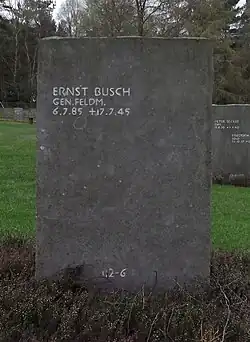 Nach seiner Gefangennahme am 23. Mai 1945 wurde Busch nach England gebracht und dort im Lager Aldershot in der Grafschaft Hampshire interniert. Dort verstarb er als gebrochener Mann bereits am 17. Juli desselben Jahres, nachdem er schon länger an pectanginösen Beschwerden gelitten hatte, im Rahmen eines akuten kardialen Geschehens.[17] Er wurde ohne Zeremonie auf der Deutschen Kriegsgräberstätte Cannock Chase bestattet.[18]