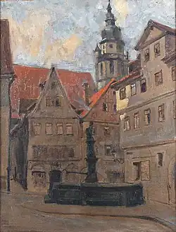 - „Aus Coburg“, idyllischer Altstadtwinkel mit Brunnen und Blick auf die Morizkirche, Öl auf Leinmwand, 1919