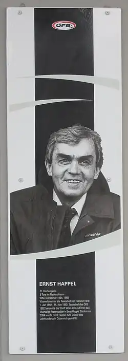 Ernst Franz Hermann Happel (* 29. November 1925 in Wien; † 14. November 1992 in Innsbruck) war ein österreichischer Fußballspieler und -trainer. Als Spieler erreichte der Verteidiger unter anderem den 3. Platz bei der Weltmeisterschaft 1954 in der Schweiz und wurde zum Publikumsliebling bei Rapid. Seine größten Erfolge konnte Ernst Happel allerdings als Trainer in den Niederlanden, Belgien, Deutschland und Österreich feiern. Aufgrund seiner eigenwilligen Art wurde Happel häufig als „Grantler“ bezeichnet. Er trainierte von Jänner 1992 bis zu seinem Tod im November 1992 die österreichische Nationalmannschaft.