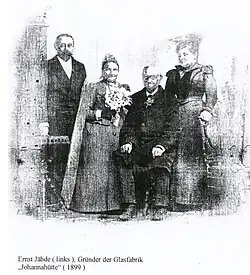 Ernst Jähde wurde als Sohn des königlichen Eisenbahnbeamten Carl Ferdinand Jähde und dessen Ehefrau Caroline Wilhelmine Christiane geb. Paul geboren. Am 24. Juli 1896 heiratete er Johanna Haase, deren Namen die Glasfabrik in Schönborn trägt.