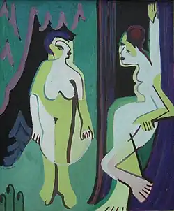Am 7. Juni 1905 schloss Kirchner sich mit Erich Heckel, Fritz Bleyl und Karl Schmidt-Rottluff – Autodidakten wie er – zur Dresdner Künstlergemeinschaft Brücke zusammen. 1906 schlossen sich Cuno Amiet, Emil Nolde und Max Pechstein als aktive Mitglieder an.[2] In dieser Zeit entwickelte Kirchner sich von einem impressionistisch beeinflussten Maler zum Expressionisten. Zu seinen bevorzugten Themen gehörten neben Aktmalerei und Porträts auch Landschaften, Stadtansichten und die Welt des Varietés. Für das Holz geschnittene Manifest der Künstlergruppe entwarf Kirchner 1906 eine stark abstrahierte Figur, die von Kunsthandwerk der Fungom-Region, Kamerun inspiriert war. Auch in seinem späteren Schaffen war Kirchner stark beeinflusst von künstlerischen Stilen Kameruns.[3] Dies wurde unter anderem durch die Ausstellung Ernst Ludwig Kirchner und die Kunst Kameruns (2008) in Zürich und Frankfurt deutlich.